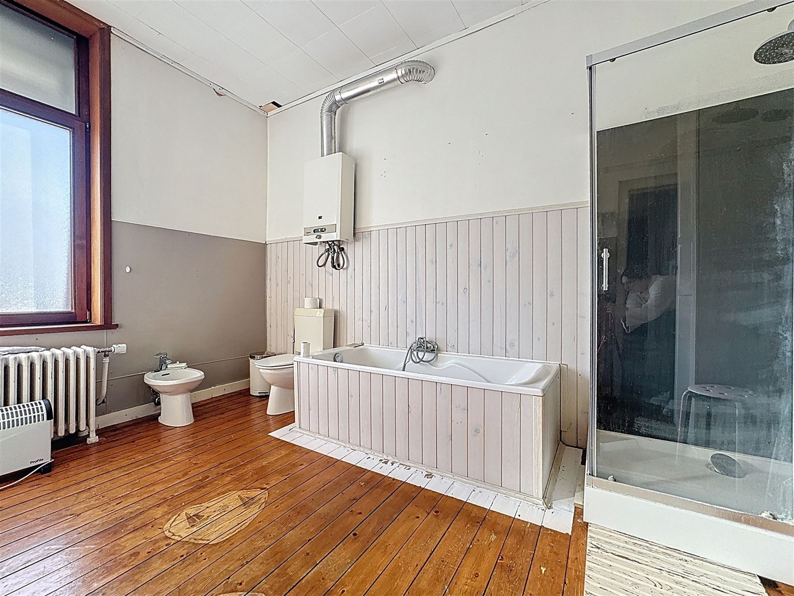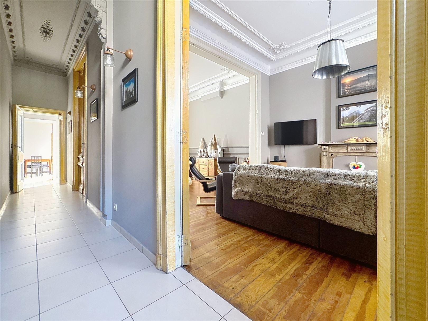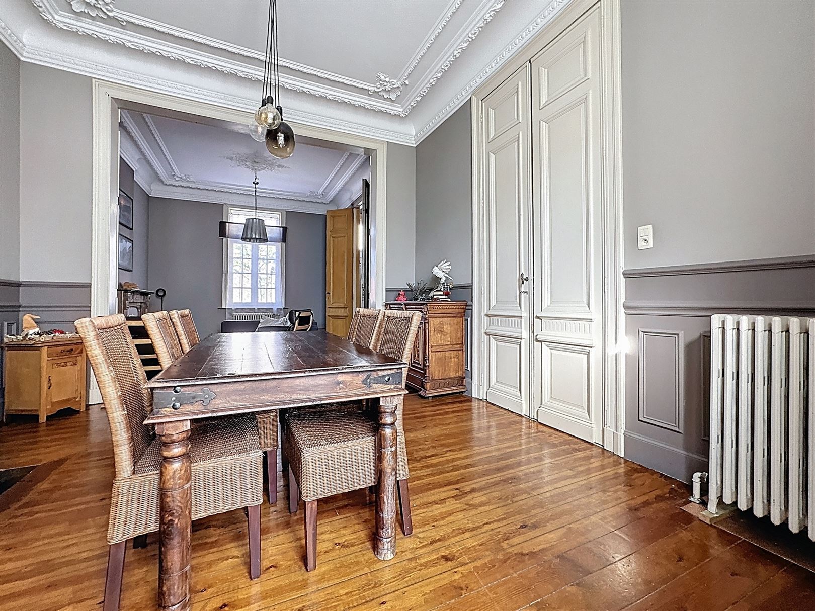 La Louvière – Centre-ville. Maison de maître de ±300 m² habitables avec partie professionnelle indépendante, jardin plein sud et caves. La partie pro (entrée séparée mais communiquant avec la maison également) comprend un hall d’attente avec WC, un cabinet et une pièce supplémentaire d’environ 35 m² : idéal professions libérales/paramédical/bureaux. La maison se compose au rez-de-chaussée d’un hall donnant accès à la partie pro, d’un living de ±40 m², d’une salle à manger de ±16 m², d’une cuisine, d’une buanderie et d’un WC. Au premier étage : hall de nuit, trois chambres (±14,5 m², ±12 m², ±13 m²), un dressing et une salle de bains avec baignoire, douche et WC. Au second : grenier de ±37 m² aménagé en 4e chambre. Sous-sol : vastes caves. Extérieur : Jardin orienté sud. Atouts techniques : panneaux photovoltaïques, chauffage central au mazout, châssis PVC double vitrage, électricité conforme. Emplacement central à proximité immédiate des commerces, écoles et transports. Un bien de caractère aux volumes généreux, prêt pour conjuguer vie familiale et activité pro ou encore habitation multifamiliale. Faire offre à partir de 310.000€ sous réserve d’acceptation des vendeurs.